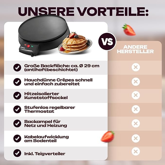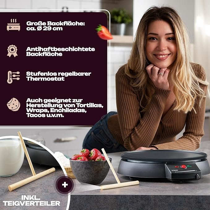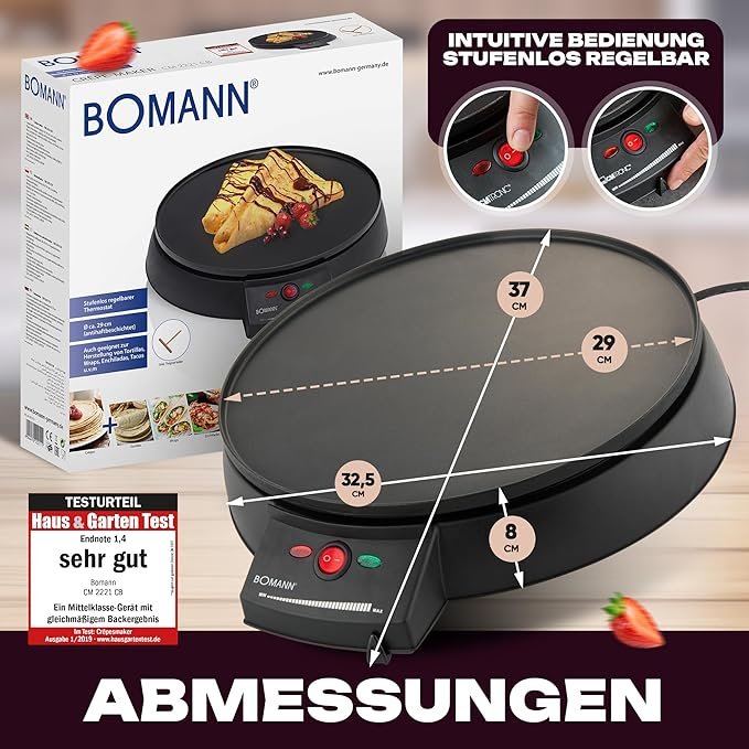 Crêpière BOMANN Magnifique crêpière électrique, du matériel de très bonne qualité vous offrant la possibilité de faire d’excellente crêpes faites maison. Elle vous facilitera la préparation de vos crêpes. Les crêpes seront très fines et préparé rapidement.