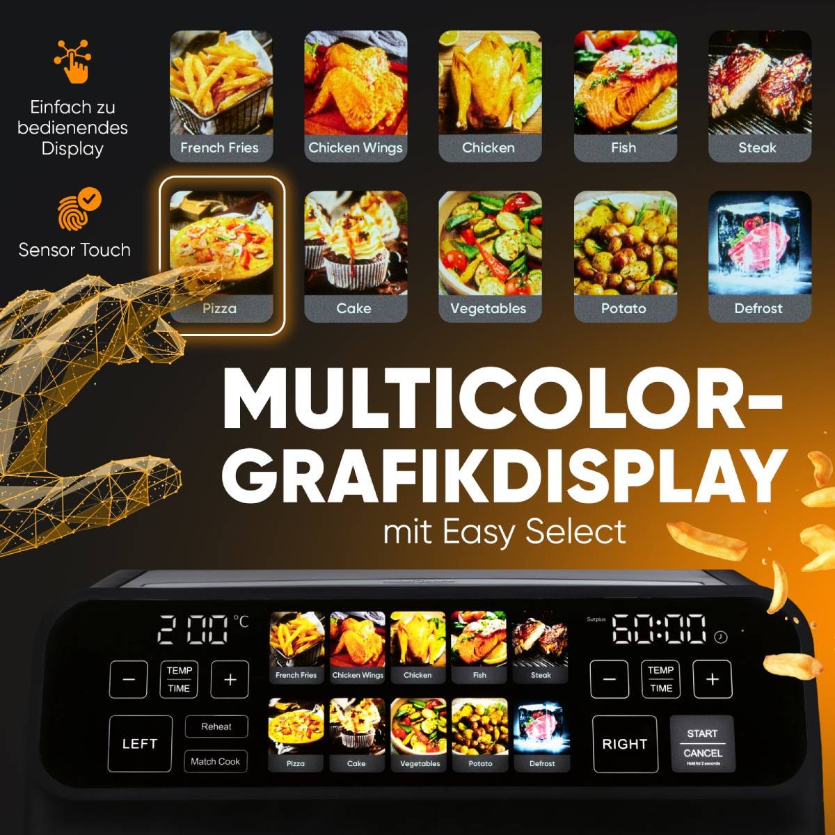 Capacité : env. 2x 4,0 litres = 8,0 litres Double friteuse à air chaud sans huile ni graisse – 2 récipients de friture séparés (capacité de 2x 4,0 litres) – Fonctionnement individuel ou combiné possible / Commande séparée – Pas de mélange des saveurs grâce aux deux récipients de friture séparés – Friture simultanée de 2 aliments différents – 2 zones de cuisson indépendantes Façade en acier inoxydable Programmes/fonctions : – 9 programmes automatiques – Fonction variable de décongélation / maintien au chaud – Réglage individuel de la durée/température Faible émission de fumée et d’odeurs Economie de temps*1 et d’énergie*2- jusqu’à 40% plus rapide et 70% plus économe en énergie par rapport à un four de classe énergétique A Écran graphique multicolore avec commande Easy Select et Sensor Touch Poignées Cool Touch / Récipients antiadhésifs 2 thermostats réglables en continu (50 °C-200 °C) Arrêt automatique, protection contre la surchauffe 220-240 V, 50-60 Hz, 2200 W Découvrez la friteuse à air chaud ProfiCook® à double chambre – votre solution pour des repas sains, efficaces et savoureux. Avec une capacité totale de 8 litres (2x 4 litres), elle offre suffisamment de place pour toute la famille. Grâce à la préparation sans huile ni graisse, vous pouvez savourer sainement vos plats préférés. Les 2 récipients de friture séparés permettent de cuire deux plats différents en même temps, sans que les goûts ne se mélangent. La friteuse à air chaud ProfiCook® à 2 compartiments permet d’économiser jusqu’à 70% d’énergie par rapport aux fours traditionnels et de réduire le temps de cuisson jusqu’à 40%. L’écran graphique multicolore avec Easy Select et Sensor Touch assure une utilisation simple et intuitive. Découvrez l’avenir de la cuisine avec la friteuse à air chaud double chambre PC FR 1287 H.