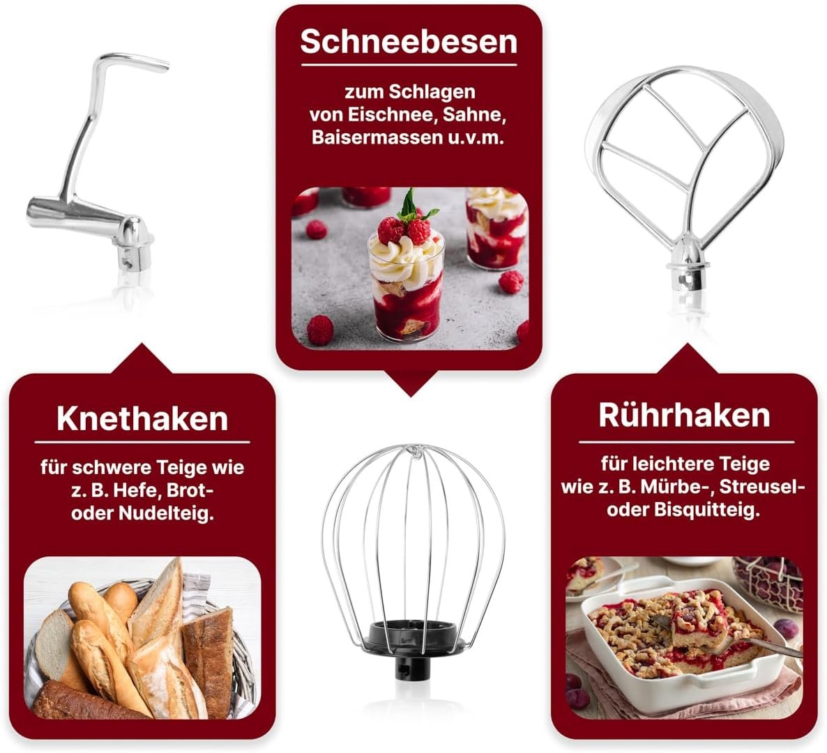 Le robot pétrin KM 3709 de Clatronic comporte 3 accessoires de pétrissage (crochet pour pétrir les pâtes lourdes comme la pâte à pain et à pizza), mélangeur pour mélanger les crêpes, la pâte battue ou les sablés et fouet en fil d’acier inoxydable pour battre les blancs d’œufs ou la crème fouettée.